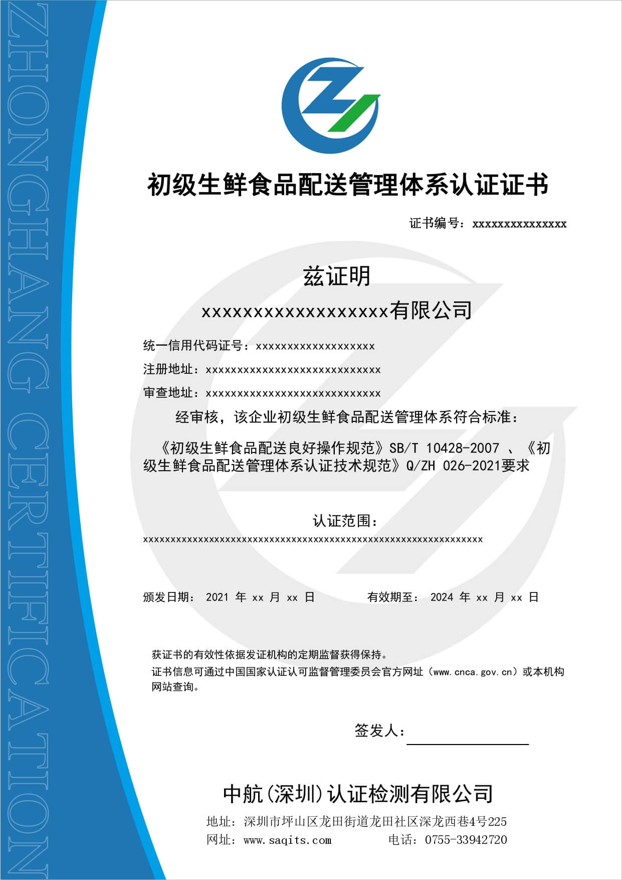 • 初級(jí)生鮮食品配送管理體系認(rèn)證證書