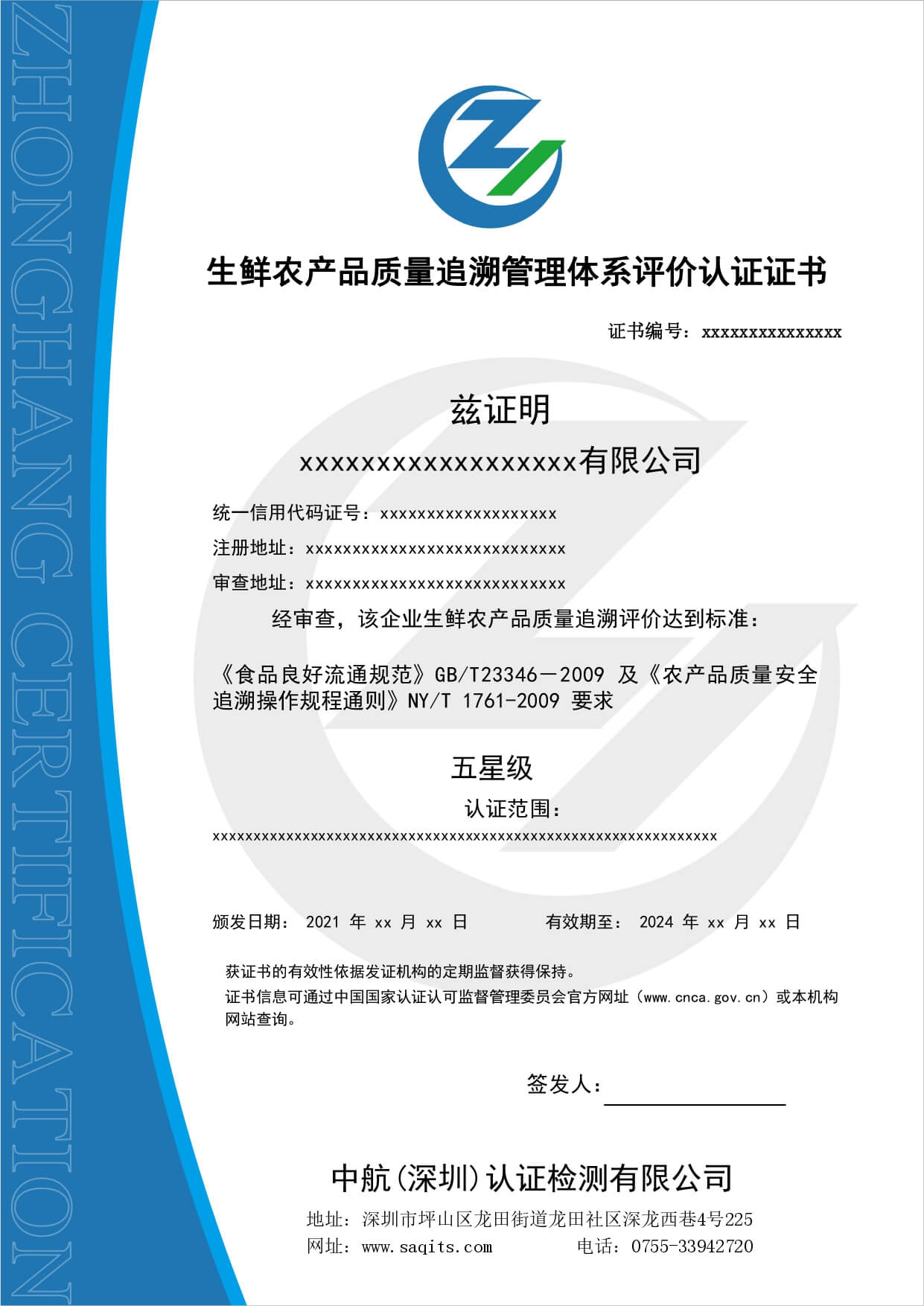 • 生鮮農(nóng)產(chǎn)品質(zhì)量追溯管理體系評(píng)價(jià)認(rèn)證證書