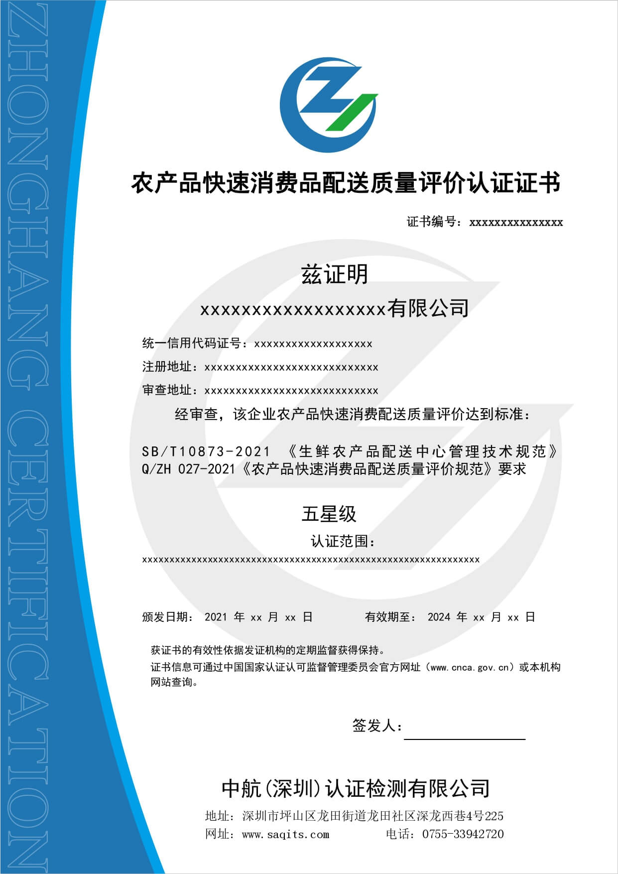 • 農(nóng)產(chǎn)品快速消費(fèi)品配送質(zhì)量評(píng)價(jià)認(rèn)證證書